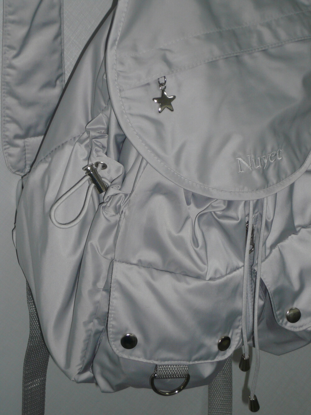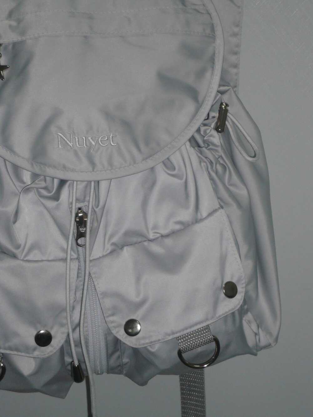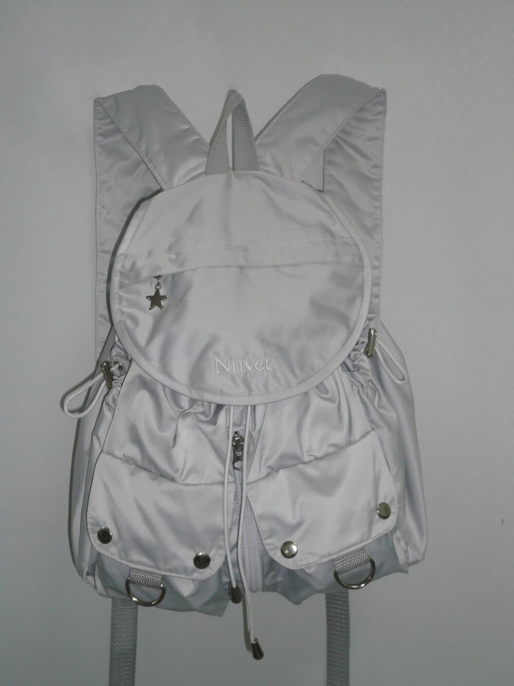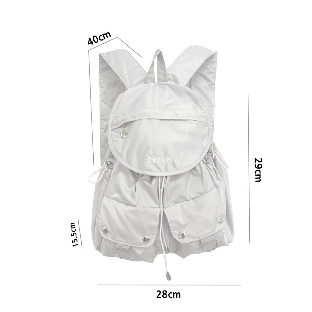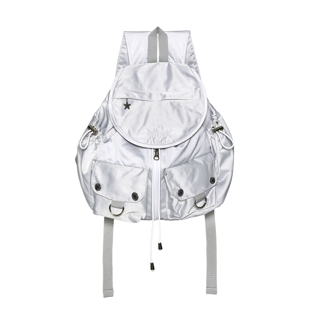 많이 넣을수록 둥글어지는 형태가 귀여운 백팩입니다. 귀여우면서 둥근 느낌으로 제작하고 싶어 단단한 원단보다 원단이 조금 얇지만 튼튼한 원단을 사용하여 제작하게 되었습니다. 앞쪽 자수 디테일과 별 모양 지퍼가 매력적인 제품입니다.